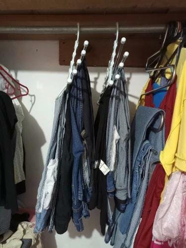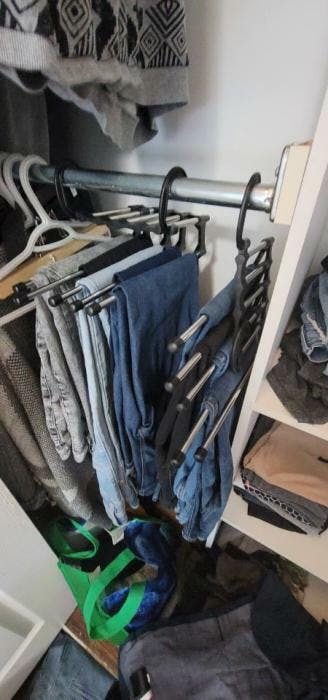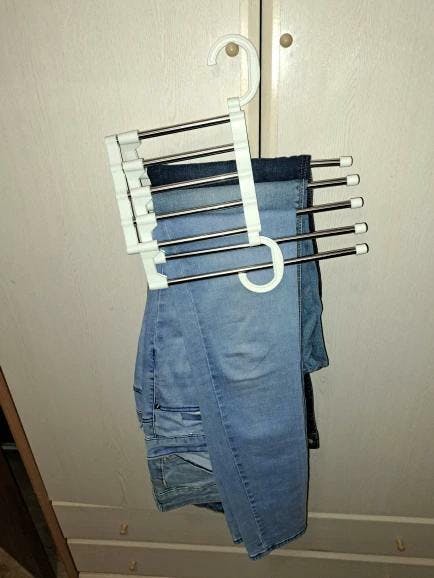 - Tough and deformation-resistant. Five pants can be stored on the rack at once.